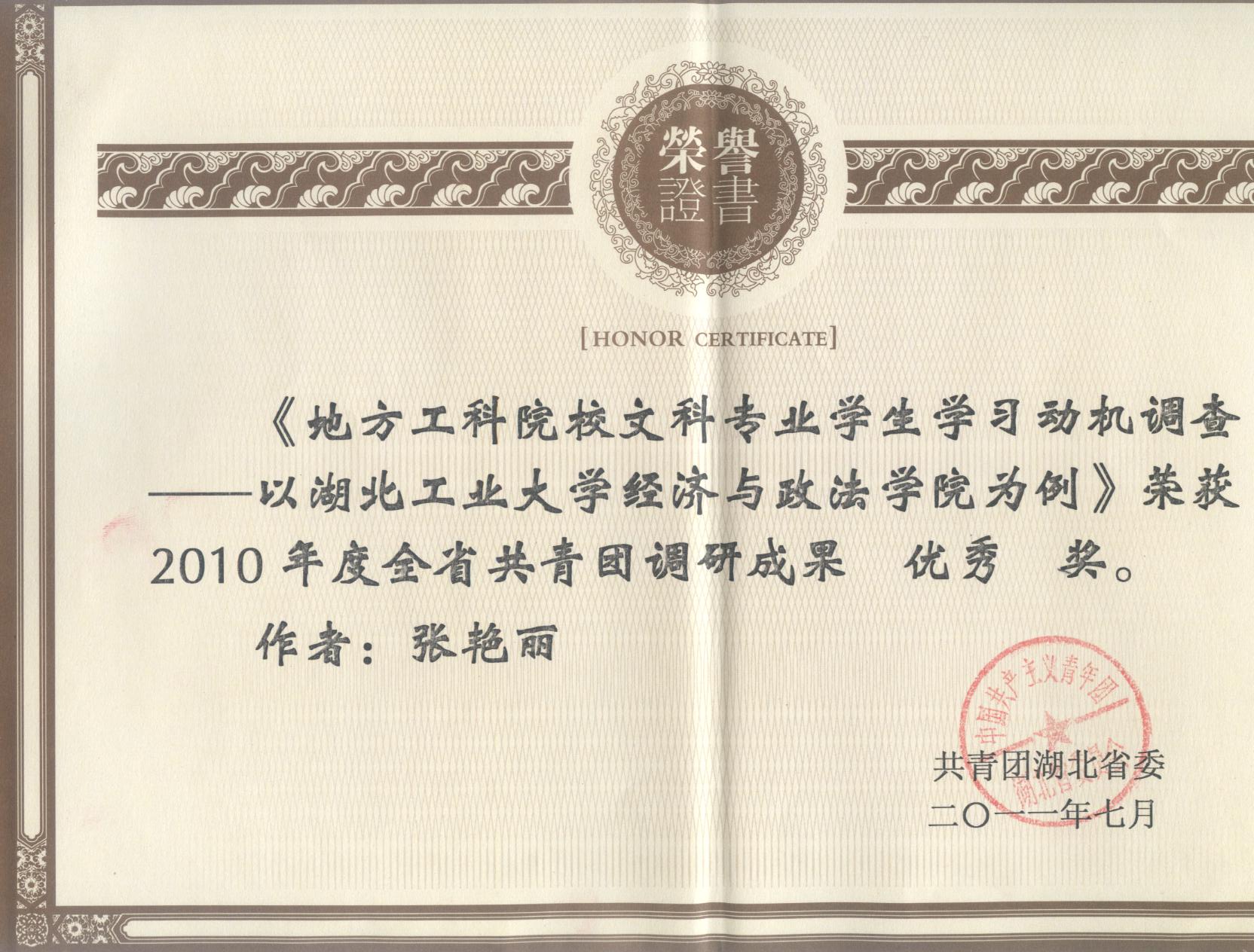 | 2010年 | 湖北省共青团优秀调研成果奖 |